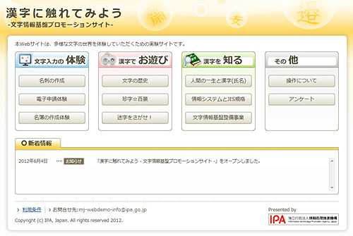 独立行政法人情報処理推進機構(IPA)は、6月4日、模擬的な文書作成やゲームを通じて、6万文字の多様な漢字を体験できるウェブサイト「漢字に触れてみよう 文字情報基盤プロモーションサイト」を2013年1月31日までの期間限定で公開した。サイトでは、一般的なPC環境では入力や表示が難しいさまざまな漢字を、インターネットを通して誰でも気軽に体験できる。