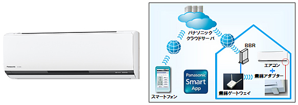 ルームエアコンは、別売のルータとアダプタを通して、アプリでの操作に対応する。Androidスマートフォンだけでなく、iPhoneでの操作にも対応する。遠隔操作ができる「どこでもリモコン」機能や、切り忘れを確認する機能、今月(現在)、先月(過去)の使用電気料金を確認する機能を備える。