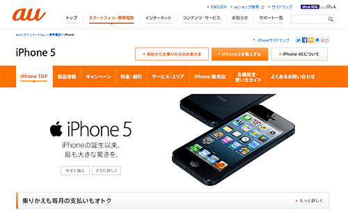auの「iPhone 5」の紹介ページ