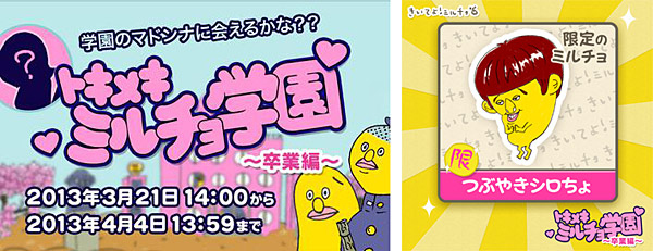 3月21日14時~4月4日13時59分まで開催する期間限定進化イベントの第二弾「トキメキミルチョ学園~卒業編~」では、3月の卒業シーズンに合わせて、「卒業までに学園のマドンナのあの子に告白できるか!?」というストーリーに沿って展開。通常モードでも、つぶやく内容によってさまざまに変化する「ミルチョ」が、イベント中、一定条件を満たすと、ふだんは見ることができない「限定キャラクター」に進化する。