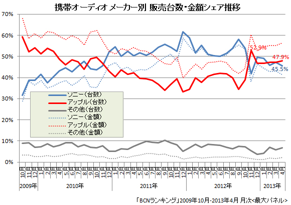 アップルのiPodシリーズ全体の月間販売台数は、12年11月以降、それまでの前年割れから一転し、前年以上かほぼ前年並みで推移している。一方、ソニーのウォークマンは、それまで好調だった反動で、12年4月以降、前年を下回っている。アップルとソニーの上位2社の寡占状態には変わりはないが、昨年秋までとは少し風向きが変わってきた。