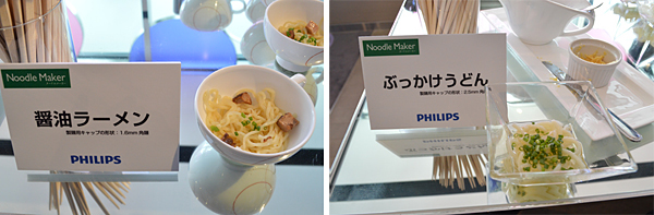 実演後は「ヌードルメーカー」で製造したうどんやそば、ラーメン、パスタを試食。インスタント麺とは一線を画するしっかりしたコシのある生麺に仕上がっていた。驚きだったのは、麺の種類によって食感が異なることだ。パスタはトマトピューレを粉に混ぜることで、酸味の効いた豊かな味わいを楽しむことができた。