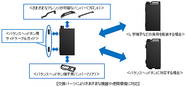 ポータブルタイプのヘッドホンアンプとして、業界で初めて、接続機器の端子やケーブルへの負荷を軽減・保護するパーツ(フロント/リアバンパー、サイドケーブルガイド)の交換に対応。ヘッドホンやデジタルオーディオプレーヤー(DAP)などの端子やケーブルに合わせて負荷を軽減する。DSD Native 5.6/2.8 MHz、PCM 384 kHz/32 bitまでのハイレゾ信号に対応するUSB DAC機能と、光デジタル入出力やバランスヘッドホン出力などの4入力/4出力(4in/4out)端子を搭載することで、さまざまなハイレゾ音源機器と接続して高音質で再生する。