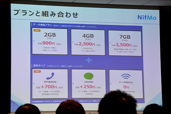 「NifMo」は、データ通信プランとオプションを組み合わせて契約する。データ通信プランは、1か月に利用できる通信容量ごとにプランを設け、2GBまでの高速データ通信ができる「2GBプラン」の月額利用料は900円、「4GBプラン」は2500円、「7GBプラン」は3500円の3種類。