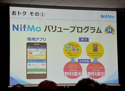 独自の割引サービスも展開する。専用アプリ「NifMo バリュープログラム」を経由し、提携する100以上のショッピングサイトで買い物をしたり、おすすめアプリをダウンロードすると支払額の数%が還元され、翌月の基本料金が割引になる。なお、還元金額が基本料金を超えた場合は翌月に繰り越すことができ、最大1年間繰り越しができる。
