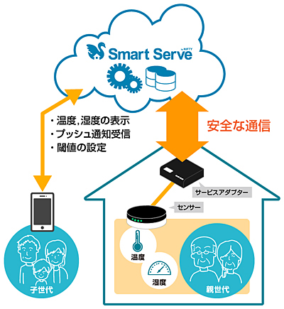 手軽なVPN(仮想プライベートネットワーク)サービス「スマートサーブ」のアダプタと、グラモの赤外線学習リモコン「iRemocon Wi-Fi」を接続し、離れて暮らす家族の部屋に設置することで、室内環境を見守るサービス。専用のスマートフォンアプリから簡単に温度や湿度を確認できるので、必要に応じて空調の使用を促す電話をかけるなど、離れて暮らす家族の健康維持とコミュニケーションに役立つ。温度や湿度などの室内環境だけを計測するので、家族のプライバシーに配慮しながら見守ることができる。