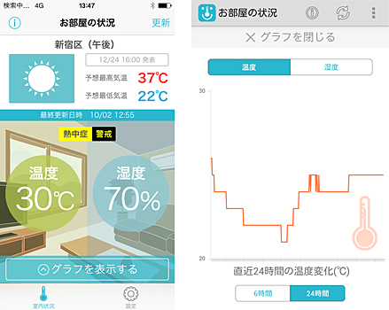 「おへやプラス」モニター版として提供していたサービスに、天気予報データとの連動機能や、季節性インフルエンザ、熱中症の予防に役立つアラート機能などを追加し、正式版として提供。室内環境の確認機能のほか、あらかじめ設定した温度・湿度になるとプッシュ通知で知らせる機能や、季節性インフルエンザや熱中症の危険を知らせるアラート機能など、家族の健康維持に役立つ機能も提供する。