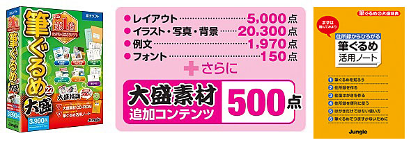 ジャングルは、ハガキ作成ソフトの最新版「筆ぐるめ 22」に、500点の追加素材を収録したCD-ROMと、「筆ぐるめ 22」の活用方法を解説した「筆ぐるめ活用ノート」を添付した「筆ぐるめ 22 大盛」を3月5日に発売する。税別価格は3990円。