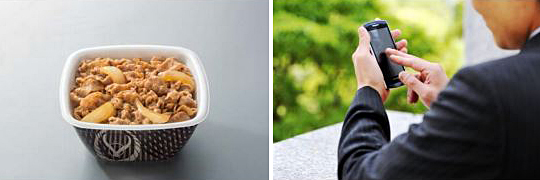スマートフォンで簡単に牛丼を注文できる。最短で15分後に受取ることも