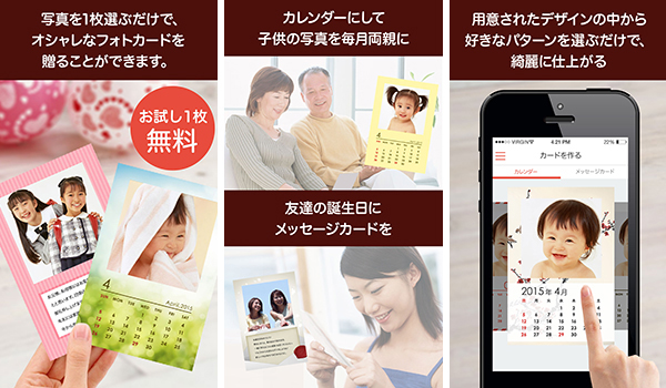 子どもの写真を簡単にカレンダーやメッセージカードにして送付できる