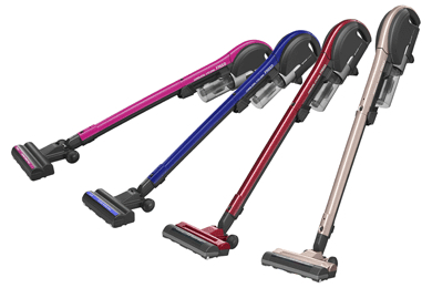 「マジックバランス」を採用したスティックタイプの掃除機「FREED 2」。左奥から、「EC-SX210」ピンク系、ブルー系、「EC-SX310」レッド系、ゴールド系