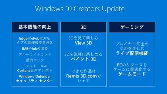 「Creators Update」は、人々の創造力の刺激や人々の創造力を広げることを目指して設計し、基本機能の向上に加え、誰でも3D制作やゲーム配信などができる新機能を追加した。3Dや複合現実といった没入型のエクスペリエンスも提供し、ASUS、Dell、HP、Lenovoの各社は、Creators Updateのリリースを受けて「Windows Mixed Reality」対応ヘッドセットを発売する予定。