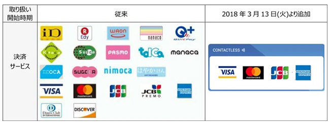 マクドナルドなどの飲食店、小売店舗の決済手段の多様化は、キャッシュレス化のニーズの高まりに加え、読み取り機の設備更新や機能強化もある。ジェイティービー(JTB)は2017年12月から、決済端末「C→REX」で新たに国際規格のNFCサービスを追加し、日本国内でAmerian Express、JCB、Mastercard、Visaの4つのブランドへの対応を開始している。