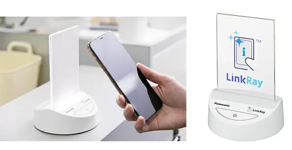 「LinkRay」対応卓上発信機(左)と使用イメージ
