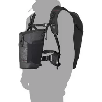 正面と両側面にフィルターやクリーニング用品などを収納できる伸縮ポケットを備えており、ショルダーベルトを付属のチェストアタッチメントに付け替えれば、Dリングを備えたバックパックのショルダーハーネスに取り付けて持ち運べる。