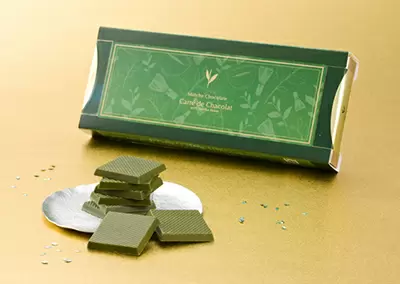「カレ・ド・茶コラ 抹茶 8個入」は、石臼挽き宇治抹茶の奥深い風味、ホワイトチョコレートのまろやかな甘味、そしてサクサクとした食感が楽しめるお茶の葉をバランス良く合わせた。お茶の風味をじわっと噛みしめる、ひと口サイズでプレートタイプの大人の本格宇治抹茶ショコラとなる。価格は1080円。