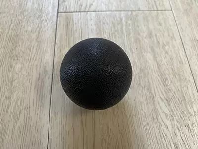 次は、今回の器具の中で最もシンプルな黒いボール。持った感じがずっしり重たく、どこか人の肌のようなしっとりとした質感が特徴だ。これは背中と壁の間に挟んで体重をかけたり、手で持って肩から胸の上あたりをコロコロしてこりをほぐす道具らしい。