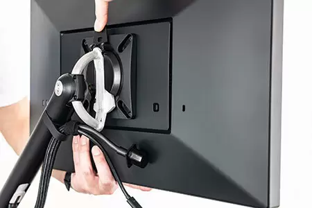 モニターに装着するVESAマウントは、モニターアームのDリングにワンタッチで着脱可能。一人でも簡単に組み立て・分解ができる。