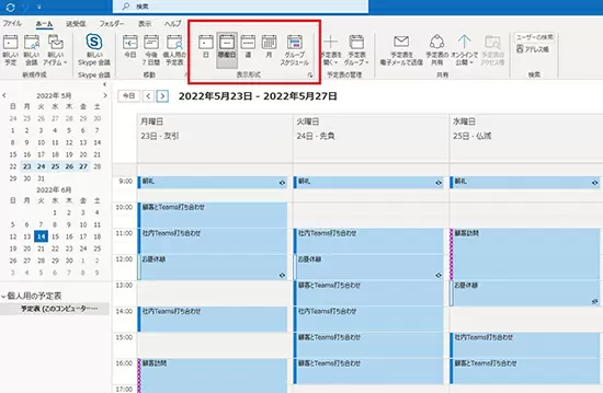Outlookの予定表もほぼ同じで、「日」「週」「稼働日」「月」「グループスケジュール」から表示を切り替えられる。