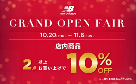 ニューバランスジャパンは10月20日、「ニューバランスファクトリーストアふかや花園」をグランドオープンする。オープンを記念して11月6日まで、商品を2点以上購入すると10%オフになるキャンペーンを開催する。