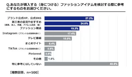 自身に似合うファッションアイテムをどのように探しているのかについて、購入するファッションアイテムを検討する際に参考にするものを聞くと、1位は「ブランド公式HP、公式SNS」(27.2%)、次いで「第三者の意見やおすすめ(家族、友人、先輩、アパレル店員等)」(24.6%)、「ファッション雑誌」(19.2%)という結果になった。ブランドの公式サイトやSNSに加え、第三者からの意見が自身に似合うアイテムを見つけるために重要なソースとなっていることがわかった。