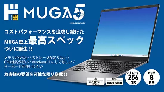 「MUGA ストイックPC5」は、エントリーモデルのPCとしては最強クラスのインテルN100をCPUに採用するとともに、Windows 11を快適に操作できる8GBのメモリを搭載し、「MUGA」史上最高スペックを実現したノートPC。ユーザーから要望が多かった、日本語キーボードの搭載、国内サポートの提供、USB Type-Cによる充電への対応を行った。