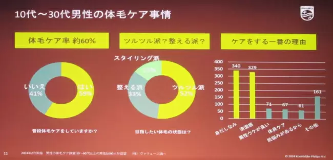 一言で体毛ケアといっても、髪はもとより手足や脇、ヒゲ、鼻、耳と部位はさまざまだが、フィリップスの調査では10~30代の男性で体毛ケアをしている人の割合は約60%。ケアをする理由では「身だしなみ」や「清潔感」が最も多くなっている。