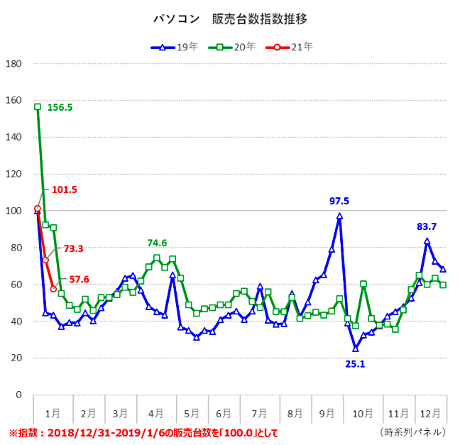 翌20年は1月14日のWindows 7 EOSを前に買い替え需要が発生し、年初から台数指数は「156.5」と高水準でのスタートを切った。その後、新型コロナウイルスの感染拡大により、社会人は在宅勤務、学生はオンライン授業などが広まったことで、パソコンの需要が高まった。そのためWindows 7 EOS後の反動減はさほど見られず4月3週には「74.6」、その後5月以降もほぼ横ばいで推移。年末商戦は19年ほどではないものの、需要の高まりが発現している。