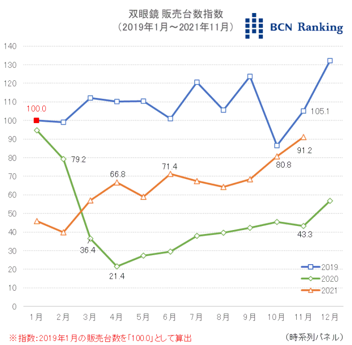 双眼鏡の販売台数低迷は20年2月、新型コロナの流行とともに始まった。19年1月を「100」とした指数は20年2月に「79.2」、3月に「36.4」、4月には「21.4」と急減。コロナ禍が長引く中、売れ行きもふるわず、指数は30~50前後で推移した。しかし、新規感染者数が減少し始め、少しずつ自粛ムードが和らいでいくと市場は反転。4月に「66.8」まで上昇、6月には「71.4」に達した。その後も順調に販売台数は伸びていき、10月は「80.8」、11月には「91.2」と回復。コロナ禍以前にはやや届かないものの、それに近い水準まで戻している。