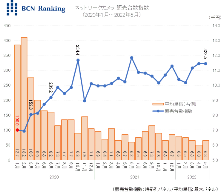 20年1月のネットワークカメラ販売台数を「100」とした指数は、「152.3」を記録した3月以降、右肩上がりに伸長。6月に「209.2」と初めて200を超え、10月には「334.4」と1年足らずの間に3倍以上の規模に達した。要因は中国のネットワーク機器メーカー、TP-LINKの新製品投入による急激な平均単価の下落だ。それ以前は、パナソニックやプラネックス、I・Oデータなどの1万円超えの製品が主流だった。しかしTP-LINKは6000円台の「KC100」や、4000円台の「Tapo C200」を投入。これによって平均単価は押し下げられ、2月の1万3200円をピークに、4月には9000円と1万円を下回った。さらに7月には7000円台、10月に6000円台に突入。20年10月以降も低価格のTP-LINK製品がけん引する形で指数は200~300前後で推移。直近の22年5月も「322.5」と高い指数を維持している。