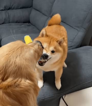 一緒に遊びたくておもちゃを豆柴の顔に押し付けているゴールデンレトリバーの動画がTwitterに投稿さ...