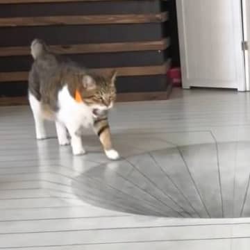 人間は錯覚を利用してトリックアートを楽しみますよね。「人間と同じで猫ちゃんもその仕掛けに騙されるはず...