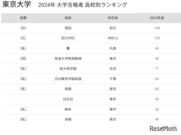 大学通信は、2024年度入試における大学合格者の高校別ランキングを特集している。「東京大学」合格者の...