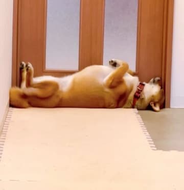 見事な「シンデレラフィット」が可愛い! ドアの前で“ヘソ天寝”する犬からわかること|獣医師解説