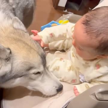 赤ちゃんが初めて『ハスキー犬』に触れた結果…驚きの『神対応』が優しすぎると40万再生「怒らないの偉すぎる」「尊くて涙」と感動の声