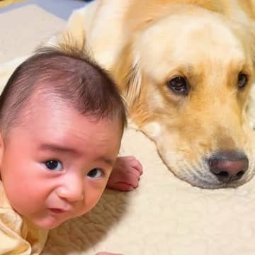 YouTubeチャンネル「ジョイの小部屋」へ投稿されたのは、ゴールデンレトリバーが可愛い赤ちゃんと遊...