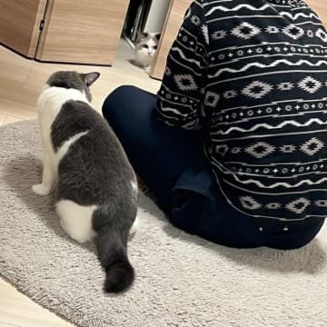 クローゼットの中で「パパと遊ぶ姉猫」を見つめる弟猫 遠くから“獲物”を狙っているかと思いきや、別の理由が?