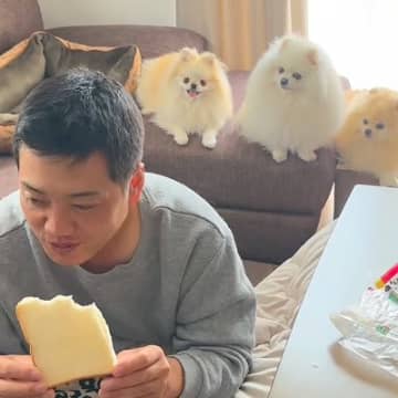 『世界一かわいいおやじ狩り』父がパンを食べていたら…3匹のポメに『完全包囲』されてしまう光景が144万再生「圧w」「視線が痛い」と爆笑