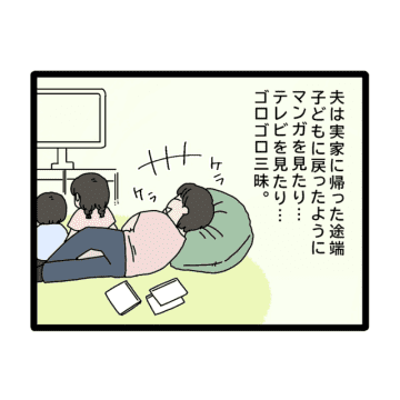 1人だけ忙しい妻を気にせず夫はくつろぎ漫画・テレビ・ゴロゴロ三昧。義実家帰省が超しんどい[13-2]|ママ広場マンガ