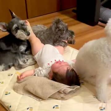 犬3匹が『赤ちゃんの布団で寝たがった』結果…微笑ましい『争奪戦』の一部始終が39万再生「超可愛い空間」「白い犬、場所取り達人すぎて草」
