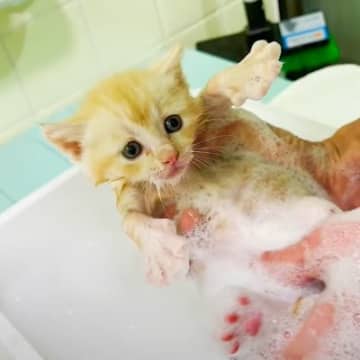 困り顔の保護子猫を『初めてのお風呂』にいれたら…『大変身する様子』が可愛すぎると12万再生「フワフワ」「気持ちいいね」