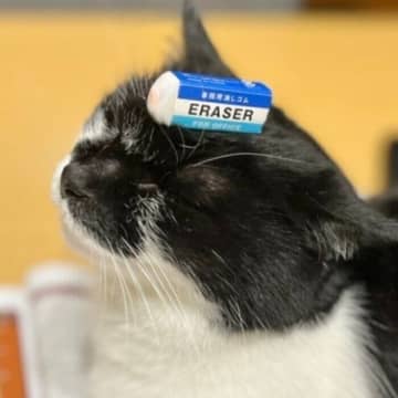 猫が飼い主さんの勉強を阻止した結果→消しゴムを頭に乗せられても動じない姿に「嬉しそうですね」「これは飼い主さんの負けだな」と5.3万人注目