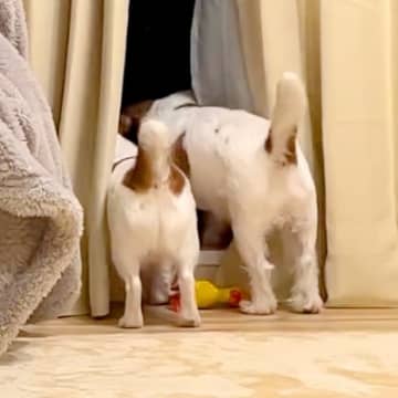 犬2匹と『かくれんぼ』した結果…『まんまと騙されてしまう姿』が可愛すぎると3万再生「あれっ?てしてるw」「めっちゃ楽しそう」と絶賛