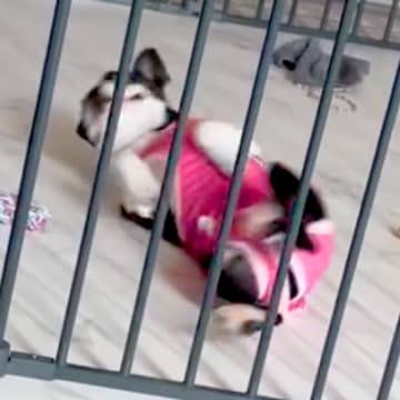 犬に『エリザベスウェア』を着せた結果…器用すぎる『脱ぎ方』がなぜか応援したくなると116万再生「一生懸命で愛らしい」「嫌なんだね」