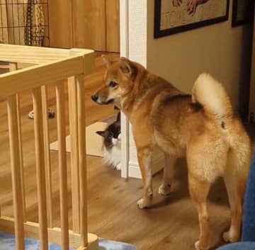 知らずに近づいてくる愛犬とこっそり待ち伏せする愛猫、その後の展開は?