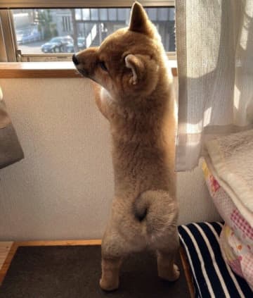 興味津々に窓の外を確認しようとする小さな子犬が、2週間後には→「後ろ姿」を比べて成長の早さにびっくり!