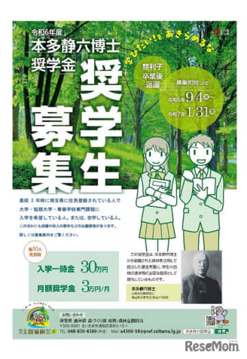 埼玉県は2024年9月4日、大学進学などに必要な奨学金を無利子で貸与する「本多静六博士奨学生」の募集...