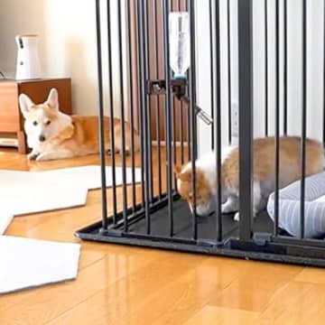 YouTubeに投稿されたのは、先輩コーギー犬が赤ちゃん犬と初めて一緒にお留守番をする様子。先輩が少...