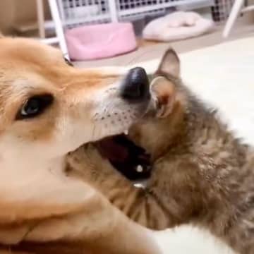柴犬と『保護して3日目の子猫』が遊んでいたら…思わぬアクシデントが182万再生の大反響「自ら食べさせにw」「優しさに泣きそう」の声