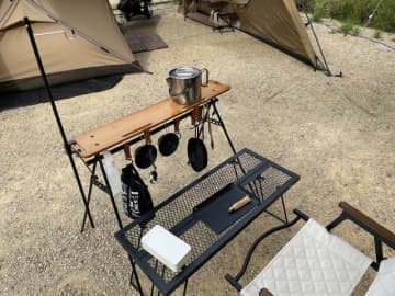 100均ダイソー「ハンギングラック」で使える! ウッド天板 “ガッチリ固定” の裏ワザ! キャンプ実践レポ